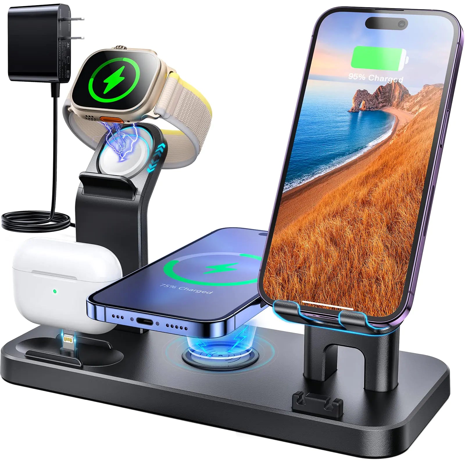 You could quickly charge all your apple devices on this 5 in 1 fast wireless charging station! This charging dock is compatible with all apple phones apple watches and AirPodsand all Android phones with USB-C ports.